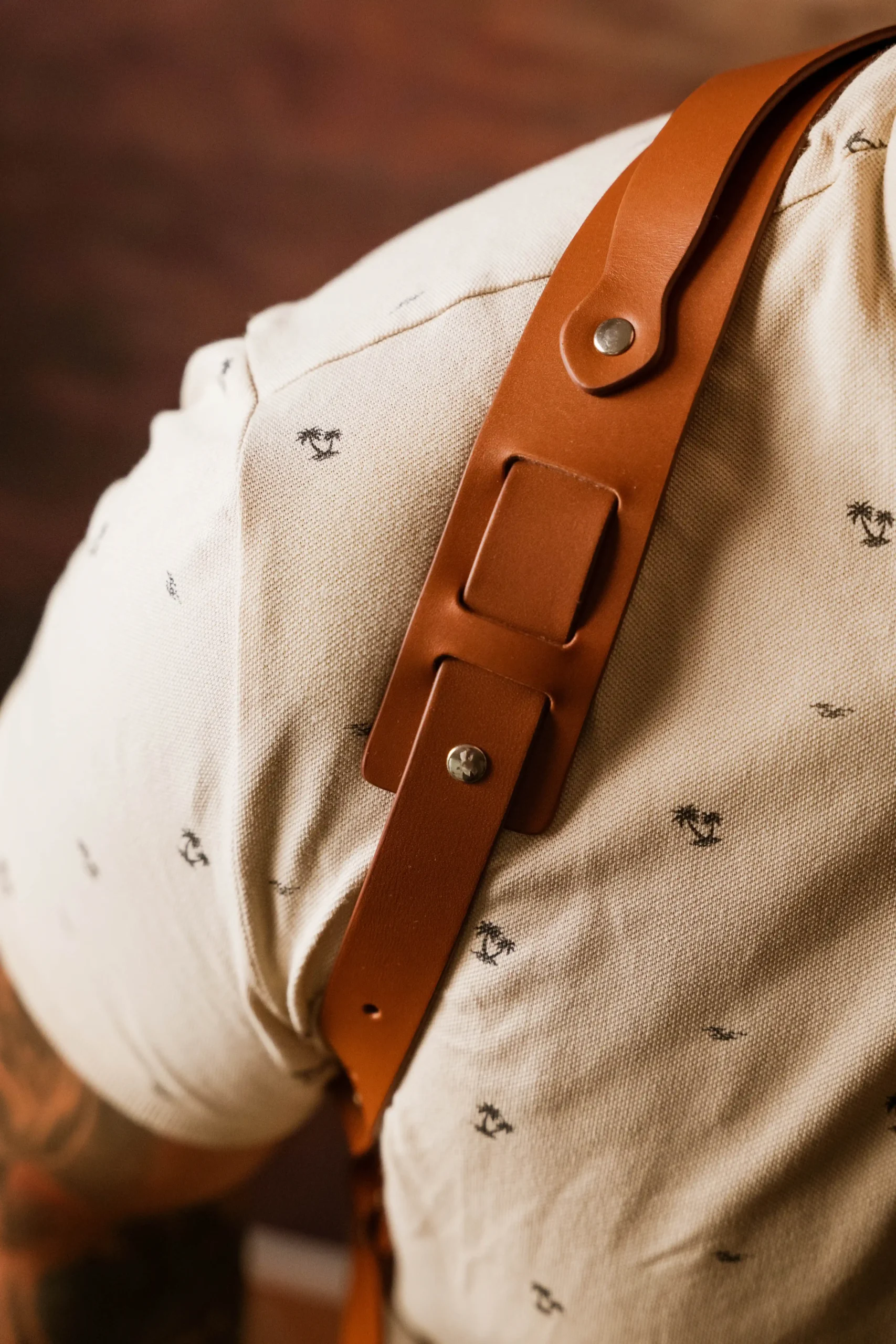 Questa tracolla viene realizzata interamente a mano ma quello che la rende speciale è la possibilità di personalizzarne le misure per adeguarla al corpo di chi la indossa. Con un pratico sistema di rivetti a vite, l’utente avrà la libertà di modificare le lunghezze sia delle fasce che avvolgono le braccia sia della fascia con il moschettone per agganciare la fotocamera.